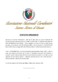 ASSOCIAZIONE NAZIONALECARABINIERI STATUTO ORGANICOApprovatocondecretoPresidenziale n.1286del25luglio1956conle variantideliberatedalConsiglio Nazionalenellesedutedel27aprile 2006e2ottobre2007.F.n.8/4303in data30gennaio2007delMINISTERO DELLADIFESA–UfficioLegislativo. IscrizionenelRegistrodellepersone giuridiche,aisensidell’art.2delDPR 10febbraio2000n.361con protocollon.33476/1471/2007AreaV URPGindata22maggio2007della PrefetturadiRoma–Ufficio Territoriale del Governo.N535–DISPOSIZIONIVARIE–Decreto delPresidentedellaRepubblica25luglio1956,n.1286,colquale, sullapropostadelMinistroperladifesa,la“Associazione NazionaledelCarabiniereinCongedo”assumeladenominazione di“AssociazioneNazionaleCarabinieri”e,tral’altro,neviene approvatoilnuovostatutoorganico.–(Direzionegenerale personalicivilieaffarigenerali).–(Gazzettaufficialen.298,del24 novembre 1956.Estrattodelladispensa50^delGiornaleMilitareUfficialedel15 dicembre 1956Lo Statuto Organico dell’Associazione Nazionale Carabinieri puo’ essere interamente visionato tramite il seguente link